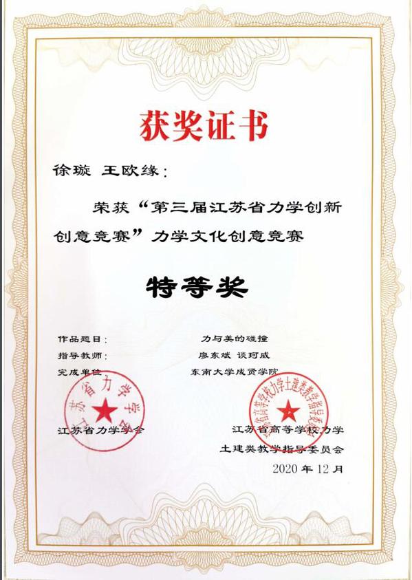 近日,“第三届江苏省力学创新创意竞赛”评审工作落下帷幕。我校土木与交通工程学院廖东斌、谈珂威、陈亮三位老师积极组织,精心备赛,在他们的指导下,徐璇、王欧缘两位同学的作品《力与美的碰撞》获力学文化创意竞赛特等奖(第一名),梁竣皆、蒋浩、秦晓欣三位同学的作品《奇妙的反重力水滴》获力学微文竞赛一等奖,李文涛、胡玮、沈伟伟三位同学的作品《不“科学”的科学》以及张孟睿、禹湘、孙文韬同学的作品《在客船上的跳远问题》获力学微文竞赛二等奖。