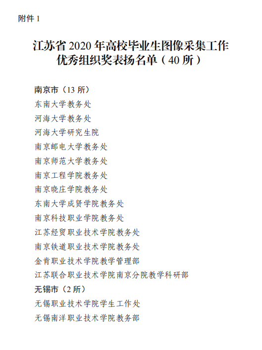 近日,江苏省高校招生就业指导服务中心公布了江苏省2020年高校毕业生图像信息采集工作表扬名单,我校教务处荣获“江苏省2020年高校毕业生图像采集工作优秀组织奖”。