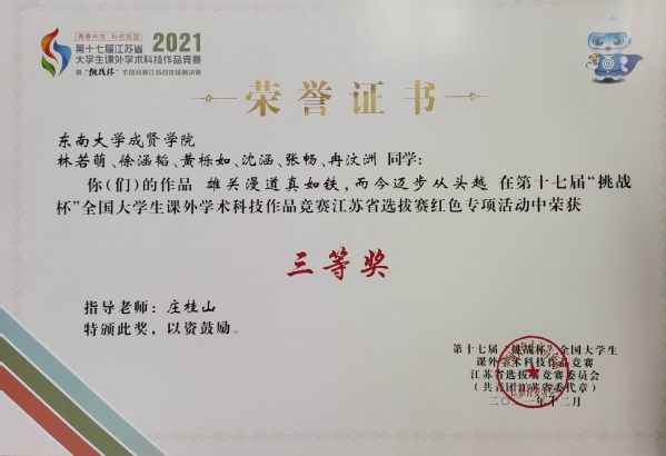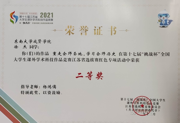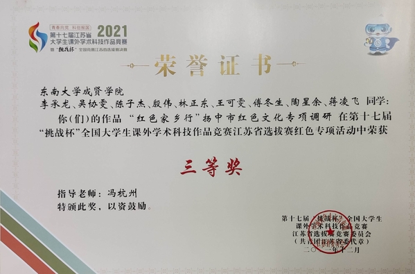 69vj 2021年寒假社会实践成果卓越,在第十七届“挑战杯”全国大学生课外学术科技作品竞赛红色专项活动江苏省选拔赛中获多项荣誉。我校选报的“重走会师圣地,学习会师历史”实践团荣获江苏省选拔赛二等奖,“红色家乡行——扬中市红色文化专项调研”实践团和“雄关漫道真如铁,而今迈步从头越”实践团获江苏省选拔赛三等奖。