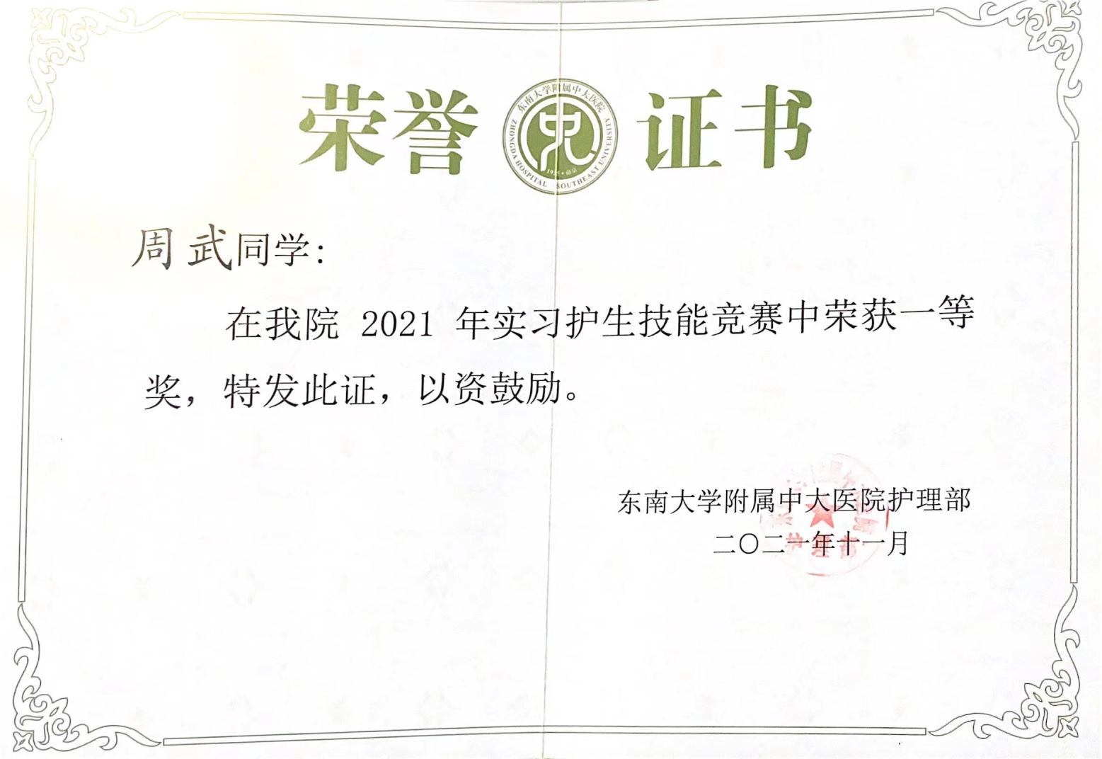 2021年10月下旬,69vj 附属中大医院护理部开展了以提高护理实习生临床技能,增强护理实习生学习积极性和主动性为主旨的操作竞赛,经过为期一周的选拔和抽签,最终有11名同学代表69vj 参加本次比赛。比赛项目共有两项,分别为单人院内心肺复苏技术(CPR)和无菌技术。通过专业评审团的现场打分以及工作人员赛后的反复核对,69vj 18级护理专业周武同学在本次比赛中荣获一等奖。