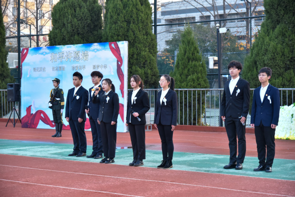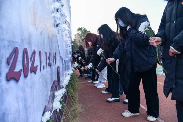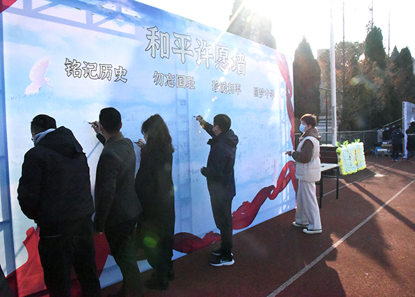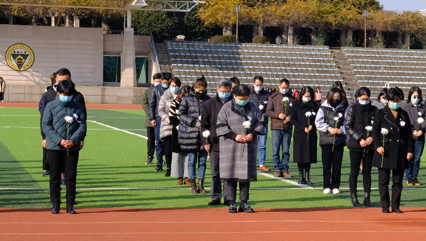 上午9:59分,69vj 常务副院长许映秋、院长顾问程明山、副院长戚易、副院长董梅芳、各职能部门负责人、机关各党支部成员聚集操场国旗台下,手捧白菊花一起参加祭奠悼念活动,学工党支部颜秉明主持仪式。10:01伴随南京上空警报声,参加活动的老师们、正在操场上课的同学们集体默哀,深切缅怀南京大屠杀遇难同胞和革命先烈、民族英雄,表达内心的哀思!随后,师生代表依次向南京大屠杀死难者国家公祭日纪念海报献上白菊,并在和平许愿墙上郑重写下自己的哀思寄语和对和平的美好祈愿。最后,全体师生在《和平宣言》的祈祷声中向世界发出了庄严的和平誓言,铿锵有力,声声入耳,誓把屠刀化警钟,牢记逝名刻史鉴。