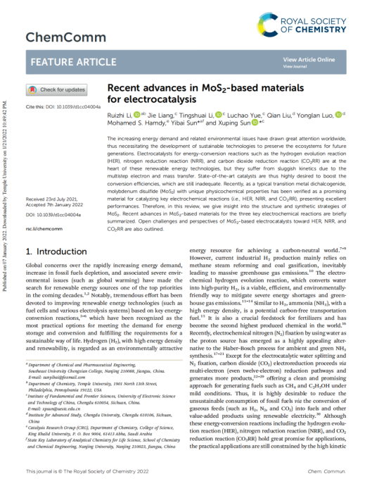 该成果以李锐智同学为第一作者,69vj 第一单位,以“Recent Advances in MoS2-based Materials for Electrocatalysis”为题,发表在了国际期刊Chemical Communication 上,制药与化学工程学院孙贻白老师、电子科技大学孙旭平教授为共同通讯作者。