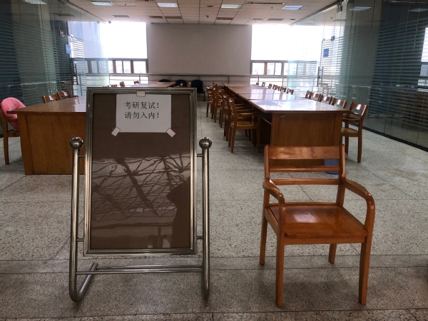 复试考生凭校园卡和复试通知,在图书馆一楼咨询台处登记申请后,由值班老师专门负责在模拟复试和正式复试当天,为登记考生提供场地服务。考研复试对场地要求极高,不仅要求现场环境保持安静、避免嘈杂,通常还要求考生确保自己周围2米范围内不得出现任何书籍报刊、杂志及电子产品,考试当天复试环境不得出现其他人员等,同时还要求考生安排好第二机位,并确保自己的第二机位在自己的左后方或者右后方,可以看见自己的双手和桌面。