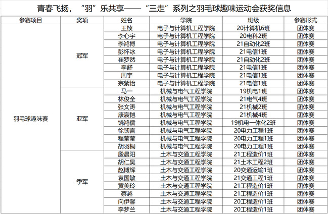 本次趣味羽毛球比赛以学院为参赛单位,设定点扔球、折返摸球接力、定点发球进圈、遮网接球和多人轮转半场淘汰赛等五个项目,采用积分排名制。赛场上,各组运动员肆意挥动着球拍,挥洒青春和汗水,享受着比赛的乐趣,表现出顽强拼搏的竞技精神,同时也展现了团队协作的良好精神面貌。经过激烈角逐,电子与计算机工程学院代表队最终夺得本次趣味羽毛球比赛的冠军,机械与电气工程学院和土木与交通工程学院代表队分别赢得亚军和季军之位。