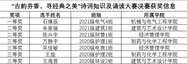 本次大赛吸引近400名同学报名参加,经过线上初赛的严格选拔共有7名选手进入线下决赛。决赛上,选手们围绕“怀古、感恩、爱国”等要义选择经典诗歌作品,将自身感悟与诗歌内容融会贯通,并结合青年学生的现状加以思考抒发内心的感想,给现场的评委和直播前的观众留下了深刻印象。经过激烈的角逐,2021级电气4班的石烽辰获得本次大赛一等奖,其他6名学生分别荣获大赛二、三等奖。