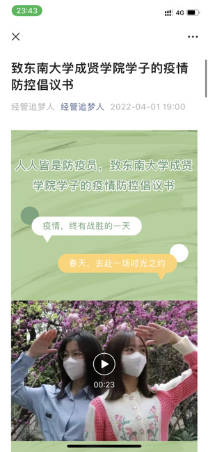青春抗疫,提升校园活力。分团委通过微信公众号发布《致69vj 学子的疫情防控倡议书》,帮助同学们理解疫情防控政策,关注疫情动态,遵守校园防疫规定,倡议“疫情面前,人人都是防疫员”,号召同学们从我做起,筑牢校园疫情防线,守护美好校园。