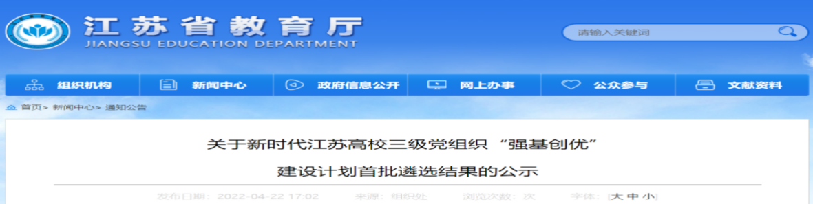根据《省委教育工委关于印发<新时代江苏高校三级党组织“强基创优”建设计划(2021—2025年)>的通知》(苏委教组〔2021〕33号)、《省委教育工委办公室关于开展党建工作示范高校、标杆院系和样板支部申报工作的通知》(苏委教办函〔2021〕36号)要求,经各高校申报、职能部门审核、专家组评审和厅专题办公会议研究,结合第三批全国高校党建“双创”入选情况,遴选产生了首批全省党建工作示范高校培育建设单位8个、标杆院系培育建设单位65个、样板支部培育建设单位505个(见附件)。