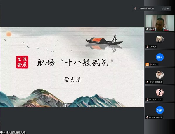 为贯彻落实党中央、国务院“稳就业”“保就业”决策部署,落实团省委、省教育厅“‘百校千企万岗’大学生就业帮扶行动实施方案”,5月25日,校团委在“云端”举办职场“十八般武艺”就业指导讲座。讲座特邀高级人力资源师、南京市就业创业指导专家常大清担任主讲, 500余名学生共同聆听了讲座。