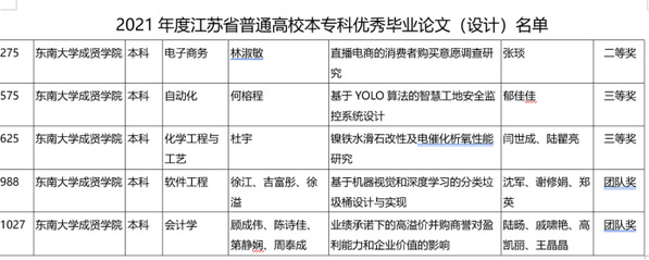 近日,江苏省教育厅发布《2021年江苏省普通高校本专科优秀毕业设计(论文)评选结果公示》,东南大学成贤学院共获优秀毕业设计个人二等奖1个、三等奖2个、优秀毕业设计团队奖2个。