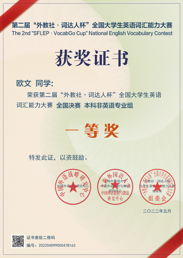 近日,2022“外教社•词达人杯”全国大学生英语词汇大赛(本科非英语专业组)结果公布。我校获得全国优秀组织奖(共10所),21级电子信息2班欧文同学(指导老师:基础部周爱萍)经过校赛、省赛的层层选拔,在国赛中脱颖而出,荣获国家一等奖。在本科非英语专业组全国众多参赛院校中,我校排名第47位,在全国同类院校中名列前茅,打破了我校以往在该项竞赛中的最高获奖纪录。