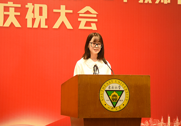 2019级化学工程与工艺2班陈可同学代表全校同学向老师们致以最崇高的敬意和最真诚的祝福,对学校、老师在学习与生活中的辛勤付出表达最衷心的感谢。她表示在党的二十大即将召开之际,青年学生能回报社会和教师的就是牢记教导,努力拼搏,发奋向上。