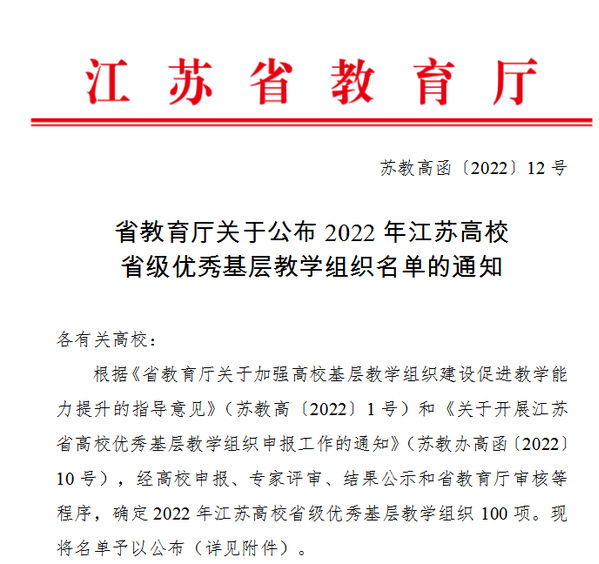 近日,省教育厅发布了《关于公布2022年江苏高校省级优秀基层教学组织名单的通知》,本次评选共选出省级优秀基层教学组织100个,其中独立学院3个,我校制药工程教研室成功入选首批省级优秀基层教学组织。