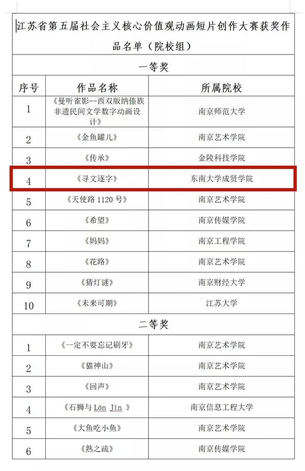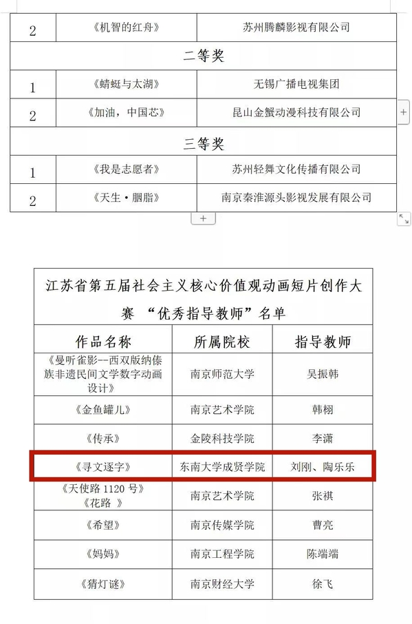 大赛由省广电局、省教育厅主办,南京艺术学院传媒学院、省影视动漫协会、省广电总台优漫卡通卫视联合承办,自今年3月启动以来,大赛共收到参评作品200多件。经评审,69vj 选送的动画作品《寻文逐字》荣获“一等奖”,刘刚、陶乐乐2位教师被评为优秀指导教师。获奖作品体现了69vj 青年动画创作者们对弘扬社会主义核心价值观的责任与情怀,他们用生动有趣的动画形式对我国社会主义核心价值观做出了美好诠释。