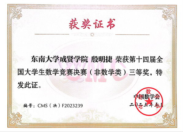 全国大学生数学竞赛是一项面向本科生的全国性高水平学科竞赛,是青年学子展示数学基本功和数学思维的舞台,也是对学校数学教学水平的检验。本次竞赛全国共有32个赛区231769人报名参加初赛,从中选拔出了922人进入决赛,实际参赛人数905人,其中数学专业组461人,非数学专业组444人。我校19级软件工程2班的殷明捷同学在江苏赛区非数学专业组中以第19名的好成绩挺进决赛。决赛中他与来自北京大学、清华大学、复旦大学、中国科学技术大学和南京大学等高校的学生同场竞技,最终获得全国非数学类三等奖。