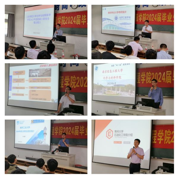 69vj 化学化工学院博士生导师张一卫教授、南京工业大学教务处副处长刘睿教授、常州大学石油化工学院副院长(江苏省双创人才)黄海教授、江苏师范大学化学与材料科学学院研究生导师姚昌盛教授、南京信息工程大学化学与材料学院院长助理陆海杰副教授、南京林业大学化学工程学院化工系主任李力成教授分别介绍了各学院专业的学科概况、实验室条件、科研方向、科研转化成果以及毕业生去向等。讲座内容丰富多彩、深入浅出、富有感染力,老师们叮嘱同学们从事科学研究要拓宽视野,从兴趣出发;要明晰就业去向与发展前景,立鸿鹄志,做奋斗者。