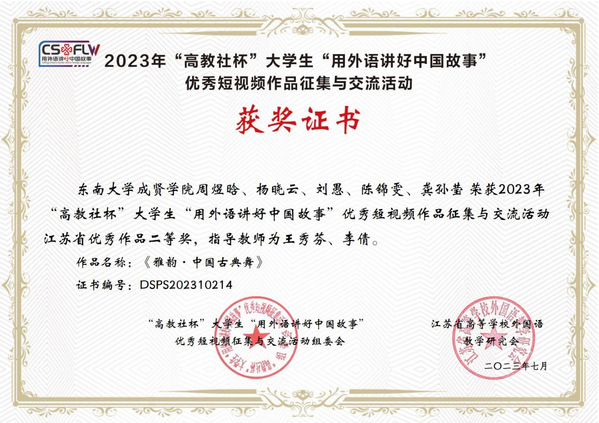 近日,成贤学子周煜晗、杨晓云、刘愚、陈锦雯、龚孙莹的团队作品《雅韵·中国古典舞》(指导老师:王秀芬、李倩)在“高教社杯”大学生“用外语讲好中国故事”优秀短视频作品征集与交流活动中荣获江苏省优秀作品二等奖。这一佳绩的取得不仅是对学院师生创作才华的高度认可,也是对中国古典舞艺术的宝贵传承,是69vj 学子在国内外传统艺术舞台展演上的闪耀时刻。