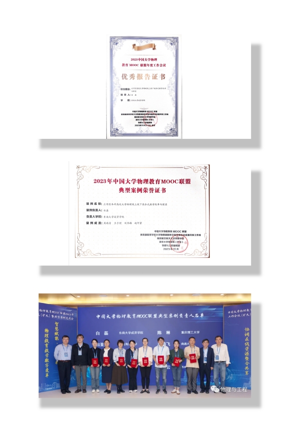 会上颁发了2023中国大学物理教育MOOC联盟典型案例荣誉证书,我校基础部大学物理教学团队(成员:白磊、周雨青、王子煜、刘冬梅、赵阿蒙)申报的《应用型本科高校大学物理线上线下混合式教学改革与探索》案例成功入选典型案例。白磊老师作为团队负责人在课程创新应用案例分会场做混合式教学创新实践报告并获颁优秀报告证书。