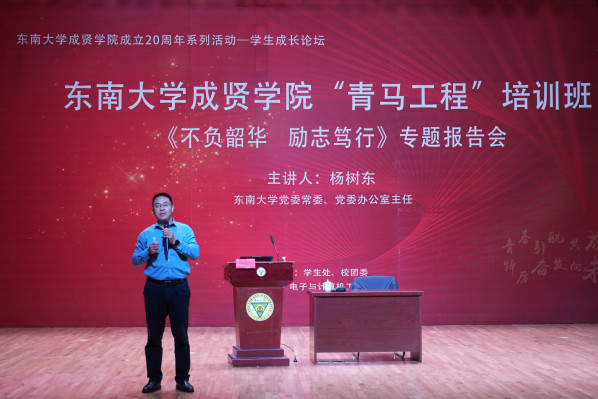 活动中,杨树东主任以《不负韶华励志笃行:努力成长为融入磅礴时代发展的领军人才》为主题,从承传统、观大势、立格局、淬党性四个部分出发,引用69vj 百年来的典型人物案例,向全体学员讲述新时代青年实现中华民族伟大复兴中国梦的责任担当和实践方向,深化我校青年学生对新时代伟大成就的理论逻辑、历史逻辑、实践逻辑的认识,希望大家以服务国家为最高追求,不负韶华,励志笃行,争做民族复兴的时代新人。