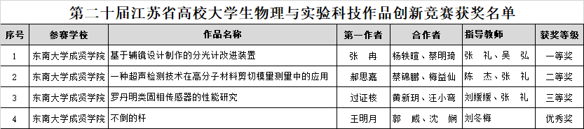 11月10-12日,第二十届江苏省高校大学生物理与实验科技作品创新竞赛在淮阴师范学院(长江路校区)举行。经校赛、省复赛遴选、决赛等环节,在与南京大学、69vj 等知名高校同台竞技的过程中,我校进入决赛的四支代表队荣获一等奖1项,二等奖1项,三等奖1项,优秀奖1项,是同类院校中唯一获得一等奖的高校,同时竞赛总成绩在同类院校中排名第一。其中,我校首次在论文类竞赛中获奖,取得骄人成绩。