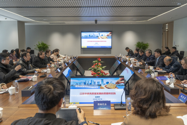 在高质量发展研讨会中,江苏华建总经理吴碧桥向与会领导、老师作了题为“江苏华建高质量发展的思路和实践”的报告,随后企业代表和学院教师代表分别围绕“企业产学研项目成果转化”“扬州城建广场建设情况”“江苏省优毕业设计申报”“装配式综合实训课程建设”“新工科微课程建设”等主题展开了汇报讨论。双方表示,今后校企之间将开展多层次交流,在人才培养、实习实训等方面互相配合,发挥各自优势,创新合作机制,共同打造高水平应用型人才聚集高地,助力学校和企业高质量发展。最后,与会领导、老师共同参观了扬州城建广场—华建总部大楼,详细了解企业发展历史、未来规划、人才需求等情况。
