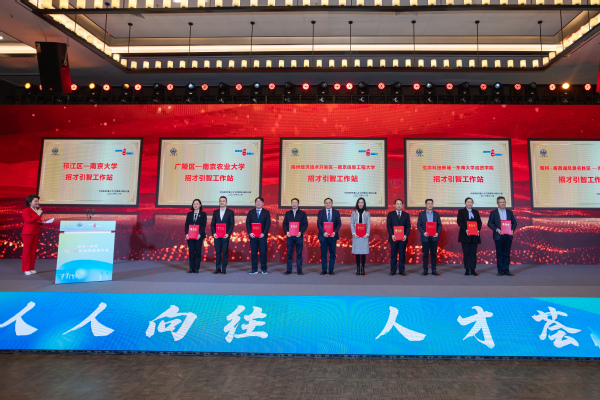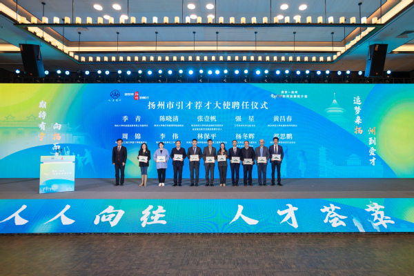 本次大会正式开通了扬州青年人才“青享码”,发布了扬州青年人才文旅研学线路。我校制药与化学工程学院院长林保平、建筑与艺术设计学院常务副院长杨冬辉被聘为“引才荐才大使”;学生处就业办程兴老师代表学校签署了招才引智工作站合作协议。