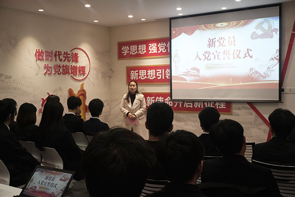 为激励党员践行入党誓词、坚定入党信念、激发爱国情怀,12月14日中午,机械与电气工程学院党总支在69vj “一站式”学生社区红色驿站举行新党员入党宣誓仪式,机电学院党总支书记严红霞、第一党支部书记邓蓉蓉及26名学生党员参加仪式,仪式由邓蓉蓉老师主持。