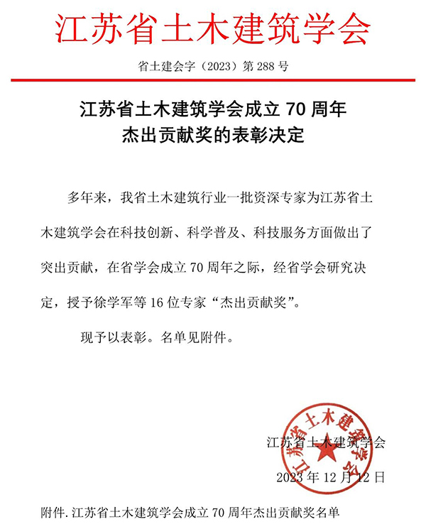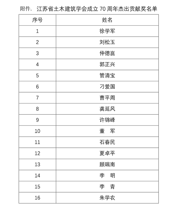 江苏省土木建筑学会下设26个专委会,7个工作委员会,涉及土建、交通、结构、施工、给排水、园林等多个领域和专业。江苏省土木建筑学会为表彰学会工作的先进工作集体和优秀科技工作者,会议期间,江苏省土木建筑学会颁发了江苏省土木建筑学会成立70周年杰出贡献奖的表彰决定。我校土木与交通工程学院院长郭正兴教授荣获江苏省土木建筑学会成立70周年杰出贡献奖。