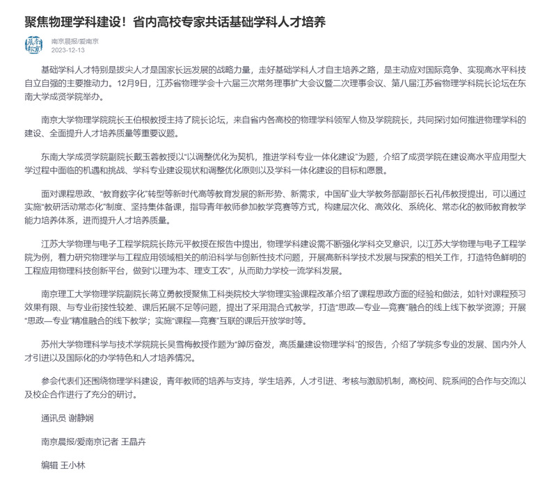【南京晨报】全省物理学科专家齐聚,探讨基础学科人才培养新模式