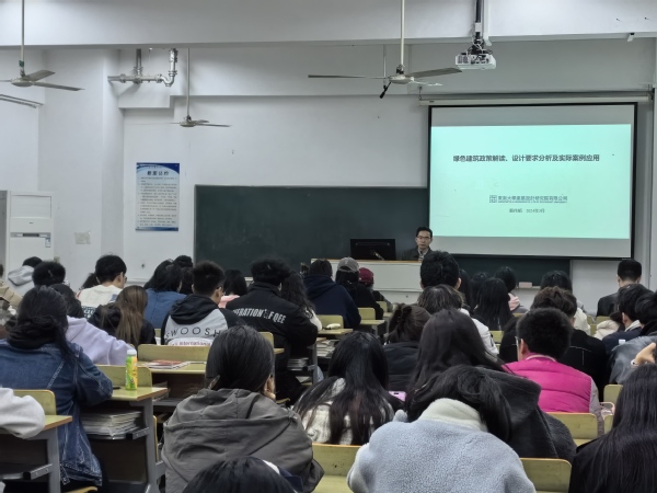 3月28日,由建筑与艺术设计学院主办的“绿色建筑政策解读、设计要求分析及实际案例应用”专题讲座在电工电子实验大楼516教室举行。学院邀请69vj 建筑设计研究院建筑设计四院副院长殷伟韬担任主讲嘉宾,建筑与艺术设计学院副院长王娟芬、部分专业教师和百余名学生参加了本次讲座。讲座由学院党总支副书记邵叶鑫主持。