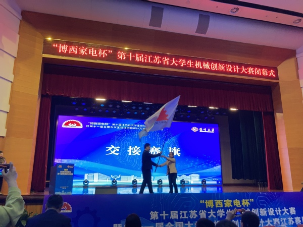 颁奖仪式结束后,我校作为第十一届江苏省大学生机械创新设计大赛的承办单位与扬州大学交接赛旗,机电学院党总支书记严红霞上台发言,她介绍了我校的专业特色和办学成效,并表示作为应用型高校,我校在人才培养和社会服务等方面更加注重应用性和实践性,重视学生学以致用、解决实际工程问题能力的培养,我校将竭尽全力,做好大赛的各项准备工作。