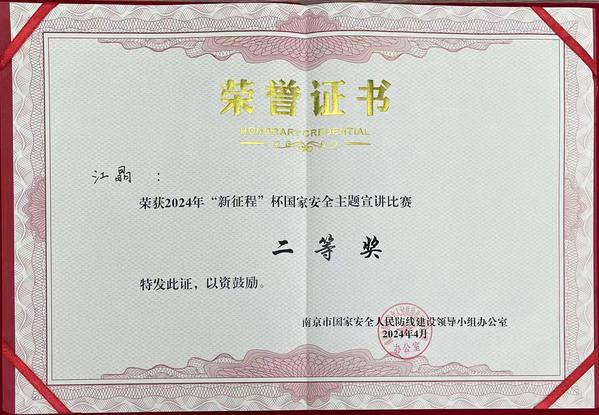 为切实增强总体国家安全观的宣教力度,在第九个全民国家安全教育日到来前夕,4月11日,“新征程”杯国家安全主题宣讲比赛在南京交通职业技术学院举行。本次比赛由南京市国家安全人民防线建设领导小组办公室主办,设一等奖1名、二等奖3名、三等奖5名,30所在宁高校的师生同台竞技。经过激烈角逐,我校建筑与艺术设计学院辅导员、思政课教师江晶以总分第3名的好成绩荣获二等奖。