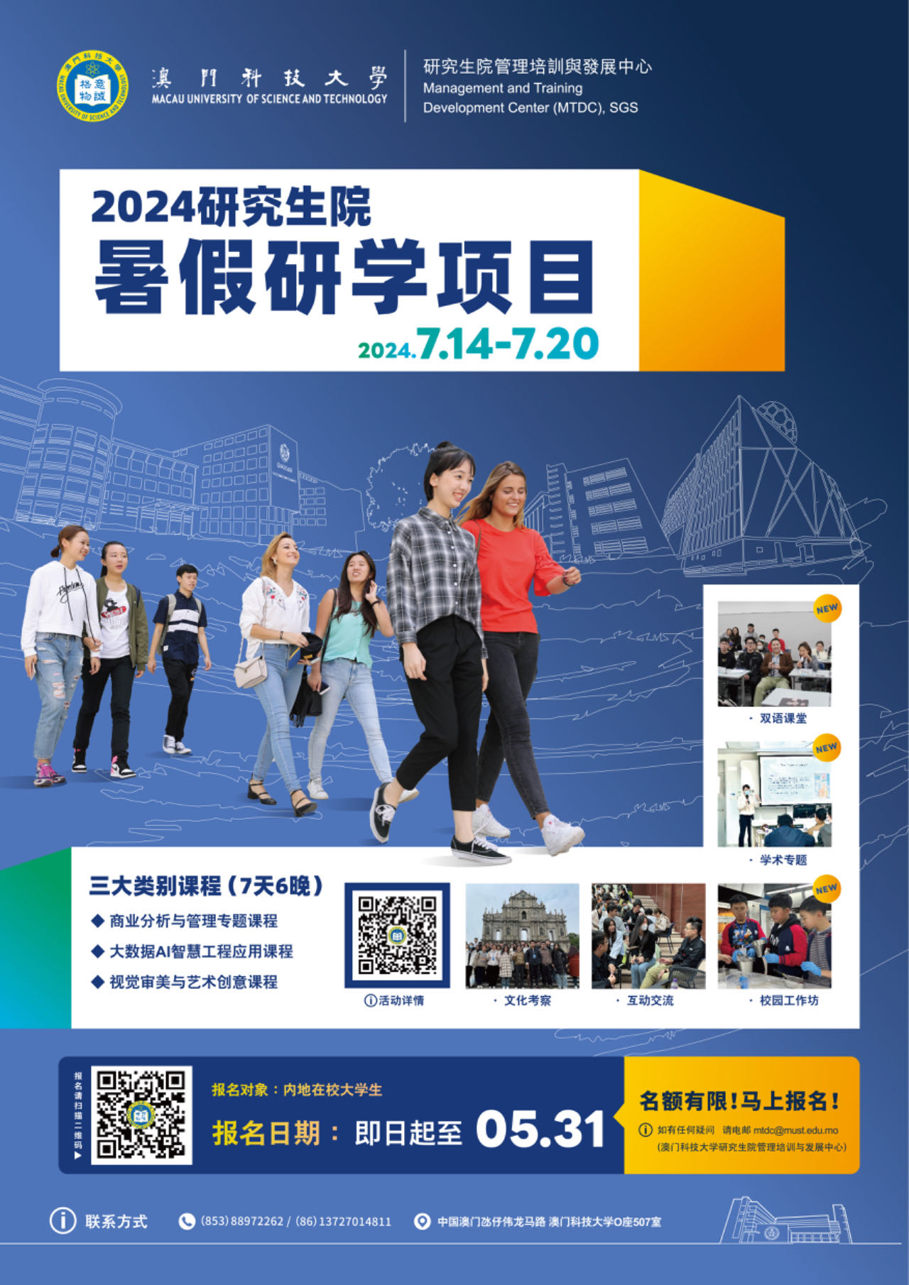 我校报名工作已于三月份开始,现报名截止日期为5月31日。请感兴趣的同学认真阅读《2024年澳科大研究生院暑假研学项目》方案,并填写《69vj 2024年澳科大研究生院暑假研学项目选课申请表》(附件2),发至邮箱:[email protected],并将纸质申请表送至真知馆310室。