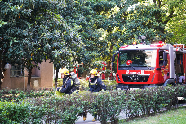 在模拟“火情”的警报鸣响后,工作人员第一时间赶赴现场,引导学生有序疏散至室外平台区域。同时,消防车到达现场,消防员在我校工作人员的协助下完成楼内人员搜索及清点等工作,最终全部人员安全疏散,整场活动井然有序。本次演练在引导疏散的基础上还增加了“固守待援”技能训练,模拟了在突发情况下室内人员无法逃生等待救援的情况,锻炼了相关人员的应急处置和避险能力。