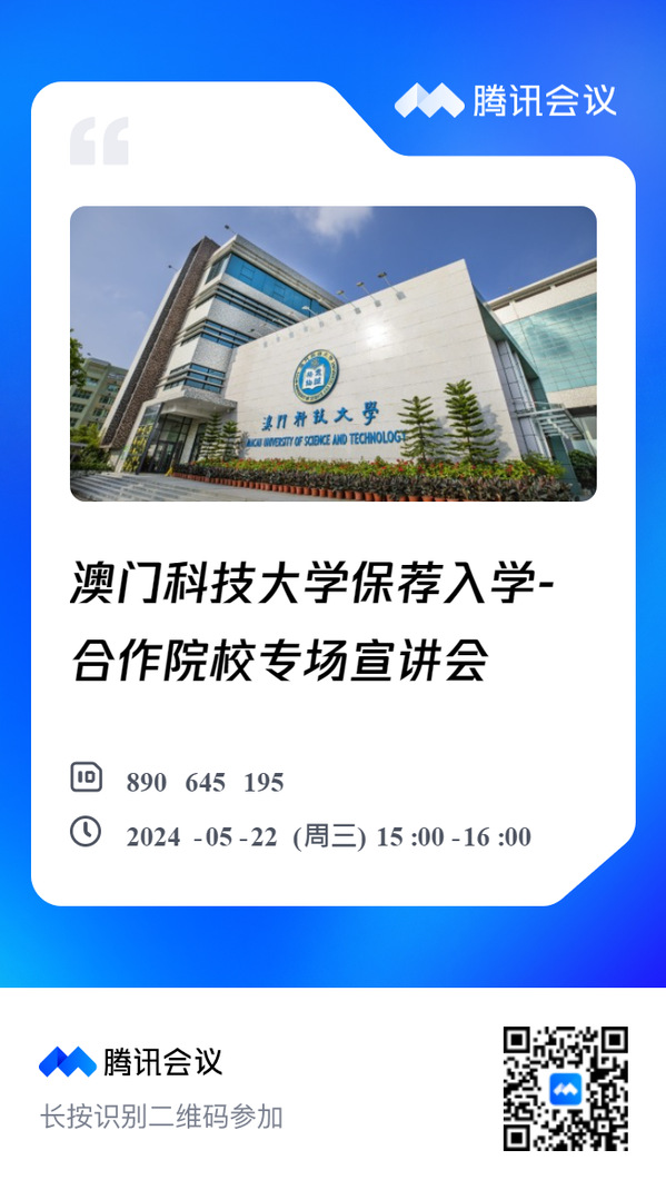 为了让我校学生能更了解澳科大的研究生课程,澳科大将于2024年522日(星期三)举办一场“澳门科技大学保荐入学-东大69vj 专场线上宣讲会”。此次宣讲会专为有意申请2025学年保荐入学的应届本科毕业生而设,旨在提供一个深入了解澳门科技大学研究生招生政策及申请流程的机会。