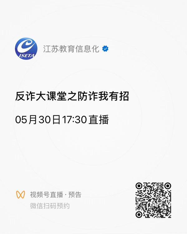 经研究,省教育厅将于5月30日(周四)下午在苏e直播平台推出“反诈大课堂之防诈我有招”直播课程,第一期邀请了南京农业大学优秀老师和南京市公安局推荐的反诈警官开展线上直播宣传活动。要求各高校组织师生观看互动,直播间也会赠送反诈小礼品。