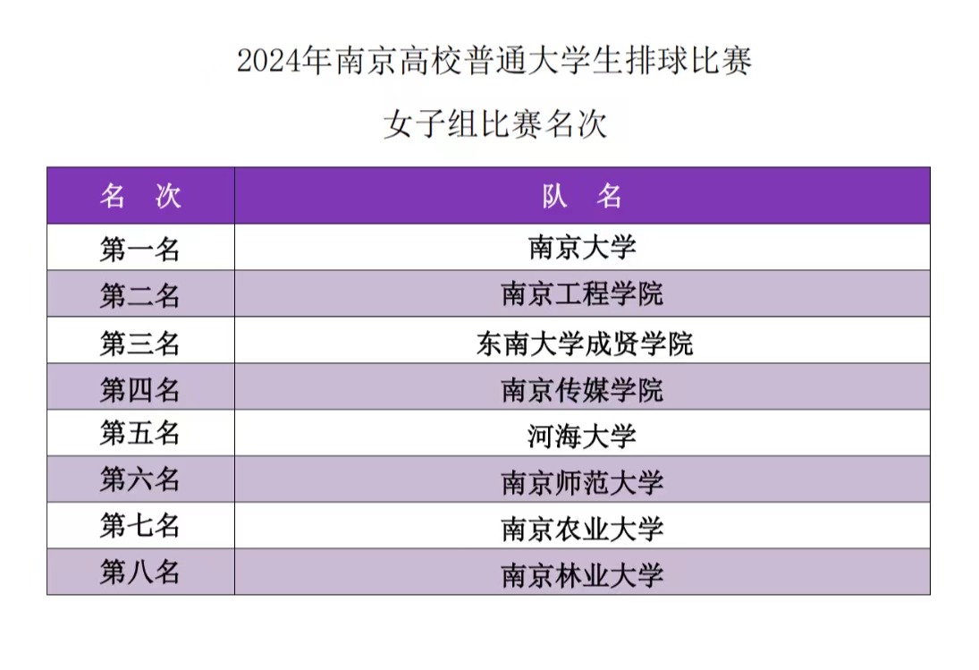 6月1日—12日,2024年南京高校普通大学生排球锦标赛在南京财经大学成功举办,我校派出男、女排球队共二十四名同学参加。来自南京的20多所高校四十多支队伍同台竞技,经过激烈角逐,我校女子排球队荣获第三名,实现我校在该项赛事中的新突破。