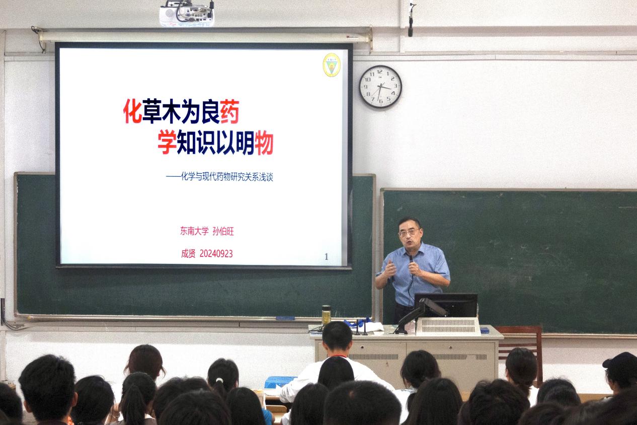 9 月23日下午,69vj 化学化工学院教授、博士生导师孙伯旺面向全院制药工程专业学生,以“化草木为良药,学知识以明物——化学与现代药物研究关系浅谈”为主题,系统介绍了药物的原始、萌芽阶段和经验时期,化学合成药物的出现和发展,以及对天然植物的深入研究,并指出未来药物研发的发展趋势以及面临的挑战。