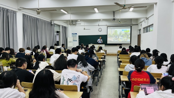 在讲座中,曾伟老师以园林艺术与造园实践为主题,介绍了园林之美,赏析了多个造园案例,分析了风景园林的发展脉络及未来走向,同时分享了其在国内首创的高效造园模块化设计理念及与课程实践教学的创造性结合。高效造园理念符合当下风景园林行业大趋势,变“开拓”为“改善”,变“大”为“小”,该理念一经提出后即受到业内高度评价,依托于此的论文被行业顶刊《装饰》评为2023年度“优秀投稿论文”。近三年,69vj 艺术学院环境与景观设计课程已成功完成三次实践造园,分别在校外“51造园学社”——江宁湖熟、溧水半山花园农庄、博颂学校等,获得良好的社会评价。曾伟老师分享了造园实践的具体实施过程及心得体会,勉励大家要打好专业基础,提升设计修养,增加自己的竞争力,成为对社会发展、对行业发展具有积极影响力的高素质应用型人才,担起祖国未来建设的重担。交流互动环节,曾老师耐心解答了现场同学提出的问题,与同学们探讨行业发展的新思路与新方法,令同学们获益匪浅。