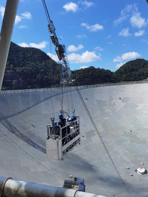 FAST(500米口径球面射电望远镜)是世界上口径最大、灵敏度最高的射电望远镜,由中国科学院国家天文台主导。为了实现望远镜的高精度定位,项目馈源舱采用六索驱动机构,并联牵引30吨重馈源舱在约140米高空和约200米范围内运动,实现馈源舱对天文轨迹的初步跟踪和舱内馈源接收机位姿的初步定位。然而,索驱动钢丝绳、滑车、缆线和牵引绳常年处于高空,人员可及性差,设备检查和维护比较困难,维护工作存在巨大挑战。郭正兴教授和朱明亮副教授团队与国家天文台团队展开紧密合作,为该项目的研发和运营提供持续的技术支持。
