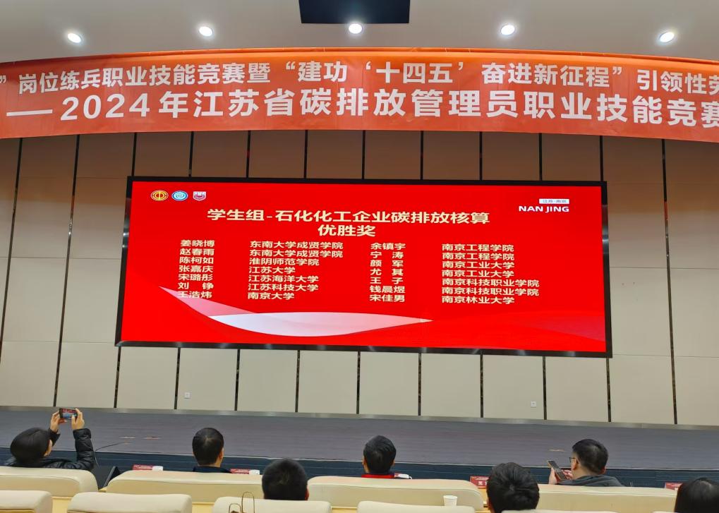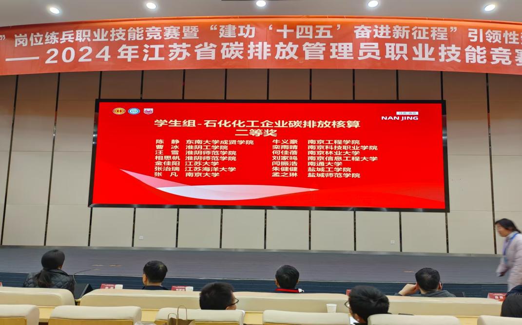 11月29日至30日,由江苏省机冶石化工会、江苏省能源行业协会主办的首届江苏省碳排放管理员职业技能竞赛在南京工业大学举行。本次比赛共有来自南京大学、中国矿业大学、南京信息工程大学等60多所高校的学生和江苏省各地发电、钢铁、石化化工和建材企业中从事碳排放管理的在职人员共200多位选手参加。我校制药与化学工程学院陈静、姜晓博、赵春雨三人,在经过理论初赛和实操复赛之后,凭借过硬的专业知识分别获得学生组二等奖、三等奖。
