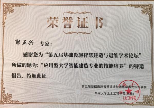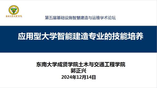 本次论坛依托大数据、云计算、区块链和人工智能等新兴技术的使用和发展,聚焦加快5G网络、人工智能、大数据中心等新型基础设施建设进度,围绕进一步统筹好新型和传统基础设施的协同融合发展,构建现代化基础设施体系,重大基础设施智慧建造与运维最新研究进展等议题展开交流研论,共同探讨我国在相关领域的卡脖子问题及其解决思路。论坛上,郭正兴院长结合“智能建造本—研—职多层次融合人才培养”议题,作了题为《应用型大学智能建造专业的技能培养》专题报告。郭院长围绕建筑工业化、数字化、绿色化融合发展,应用型大学智能建造专业的知识结构和技能结构分析,69vj 智能建造专业模块化实操技能构建与实施,智能建造综合实训课程体系建设等内容,详细报告了我校智能建造专业在专业、课程建设方面所做的尝试与探索,为国内同类高校构建创新人才培养模式,培养具有实操技能的高水平应用型本科人才提供实践经验。