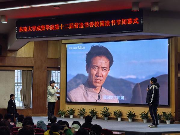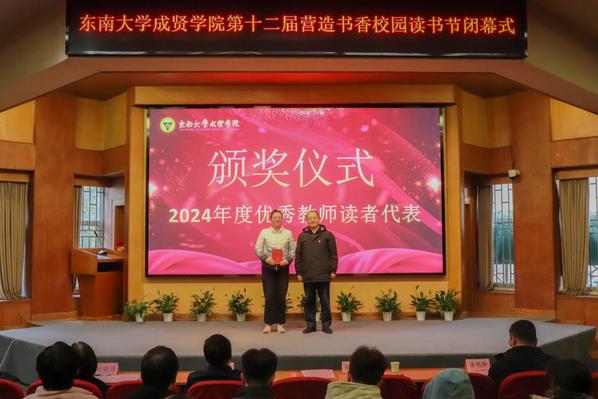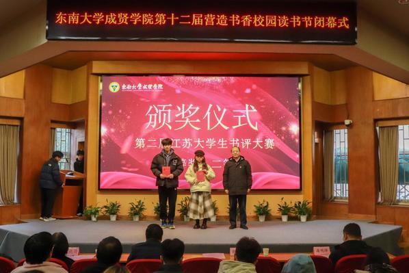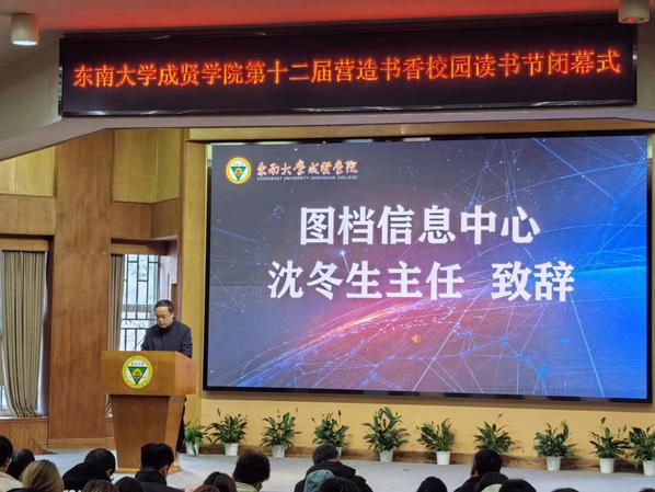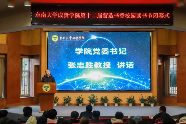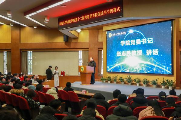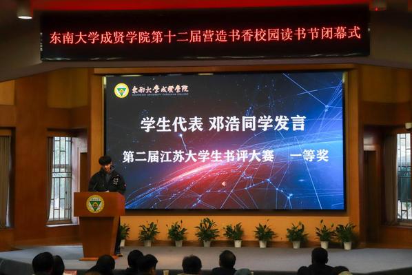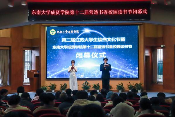 书籍是贯通古今、联系中外、传承知识的桥梁。为深入学习贯彻党的二十大精神,积极响应第二届江苏大学生读书文化节的号召,营造书香成贤的浓厚氛围,表彰先进个人,展现师生们阅读的参与热情和丰硕成果,12月18日,69vj 第十二届营造书香校园读书节闭幕式在真知馆报告厅成功举办。69vj 党委书记张志胜、团委书记潘明烽、图档信息中心主任沈冬生、图书馆馆长封晓倩、教师代表和学生代表共计260余人参与了本次活动。