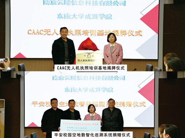 戴玉蓉副院长首先代表学校对林华桂总经理一行的来访表示热烈的欢迎。戴玉蓉副院长在致辞中表示,此次合作是学校深化应用型人才培养模式改革的重要举措。通过整合企业技术资源与高校教育优势,构建“理论+实践+认证”一体化培养体系,为低空经济领域输送高素质、专业化人才,同时也为我校创建全国一流应用型大学、培养一流应用型人才增添新的亮点。土木与交通工程学院郭正兴院长在发言中指出,无人机执照培训基地的成立,是响应国家低空经济政策、服务区域产业升级的关键布局。未来,土木与交通工程学院将牵头与兄弟院系一起联合企业开发行业定制课程,开展技术攻关,助力无人机在道路巡检、电力巡检等场景的规模化应用。林华桂总经理对我校领导的热情接待表示衷心的感谢,他在发言中提到,无人机技术正广泛应用于测绘、物流、应急管理、平安校园建设等领域,但行业亟需具备执照资质和实战能力的复合型人才。此次校企共建培训基地,不仅能为学生提供CAAC认证培训,还将引入企业真实项目,实现人才培养与产业需求无缝对接。随后,双方领导共同为“CAAC无人机执照培训基地”揭牌,南京云瞰信息科技有限公司向我校捐赠“平安校园空地数智化巡测系统”一套,助力我校平安校园建设。