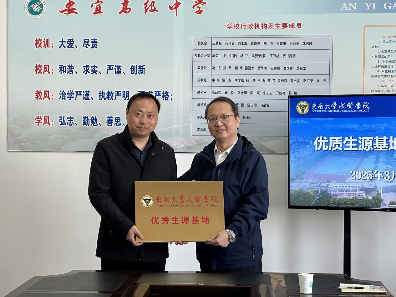 为进一步扎实做好招生宣传工作,加强与生源地中学的交流合作,3月25日,学校党委书记张志胜带队,制药与化学工程学院院长林保平、党总支书记周继荣、副院长刘媛媛、综合办主任刘庆、辅导员张怀婷共同赴扬州宝应安宜高级中学、画川高级中学开展优秀生源基地签约授牌仪式活动。