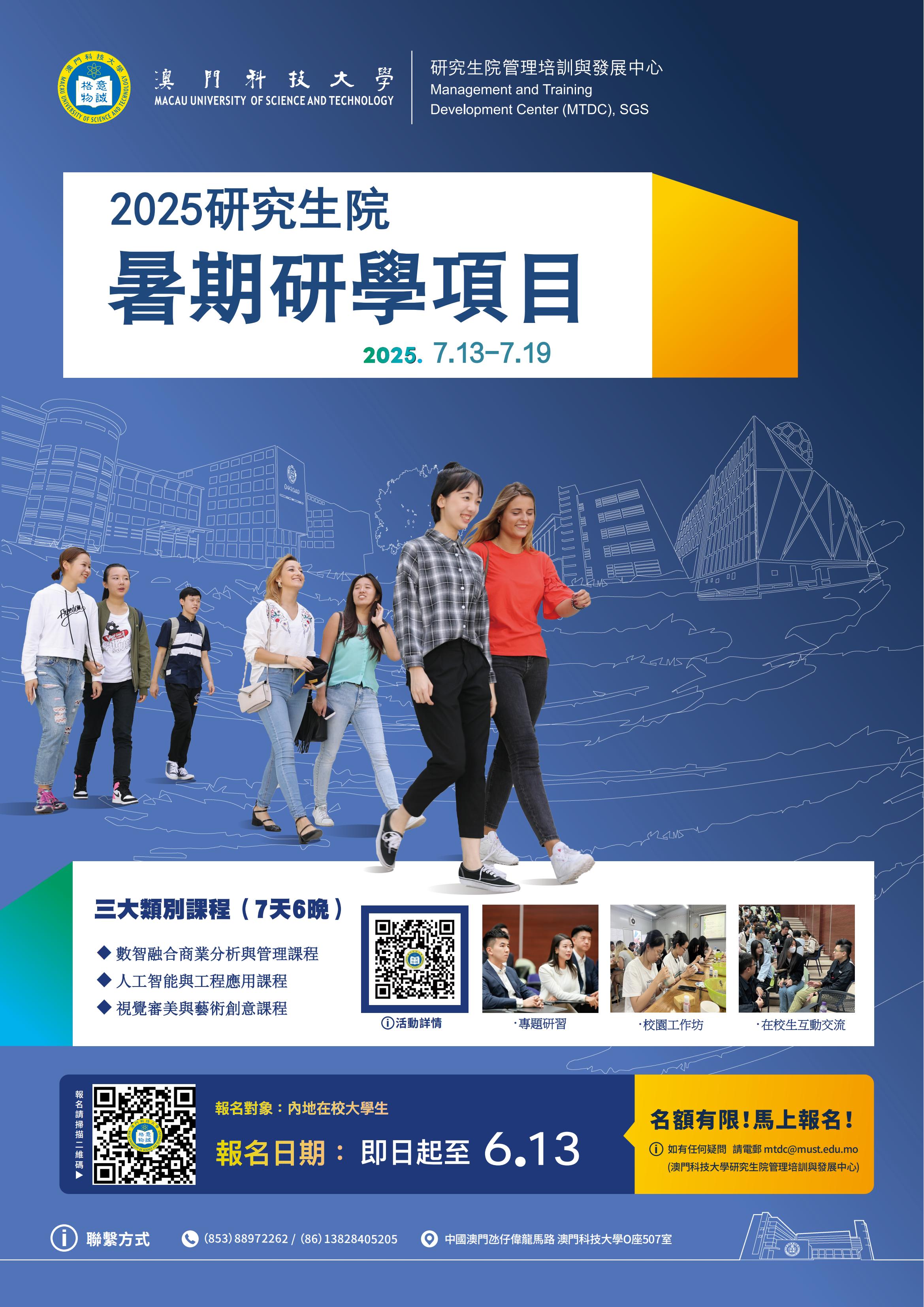 课程详情见附件正文《2025年澳门科技大学研究生院暑期研学项目》;项目结束后,学员将获得澳门科技大学研究生院管理培训与发展中心(MTDC)颁发的证书。