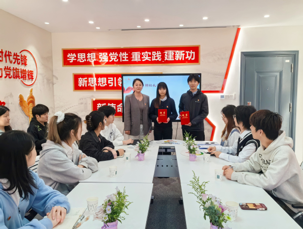 启动仪式上首先由陈涵同学介绍服务站成立的背景。当前,面对大学生思想活跃和价值取向多元等问题,在学生日常活动最重要、交流时长最长的宿舍建立党员服务站既能够及时了解学生思想动态,开展有针对性的思想引领,帮助学生树立正确的价值观,也能够让学生党员深入学生群体,服务同学,提升服务意识,树立党员的良好形象。随后葛桢杰同学对宿舍党员服务站标牌的设计进行了讲解,通过对标牌创新设计的讲解让每一位党员深刻感受到标牌背后蕴含的责任和担当。讲解结束后,第二党支部书记赵毅老师向学生党员进行了授牌,并选定桃9-426、桃16-415为首批挂牌宿舍开展服务站建设。授牌结束后陈涵同学对宿舍党员服务站具体工作职能进行介绍,通过结合其他学校的相关经验和69vj 学生需求实际,服务站明确了宣传政策、提高素养,热情服务、解决困难,收集意见、联群促通,及时处突、确保安全,组织活动、丰富生活这五项基本职能,努力为同学们提供覆盖思想引领、素质提升、学业指导、困难帮扶、管理服务和文化建设等全方位的服务。随后,土木与交通工程学院党总支书记杨阳老师为男生宿舍和女生宿舍的首任服务站站长颁发了聘书。
