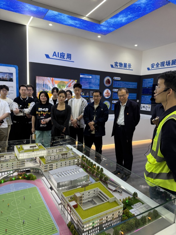 在中建三局项目团队的陪同下,师生们深入了解了南京市第二十九中学新校区建设工程的总体规划与关键技术特点。项目整体采用装配式框架结构,其中教学综合楼B区与国际交流中心兼具剪力墙结构,大幅提升了建筑的抗震性能;风雨操场与食堂则采用了钢—木张弦梁结构设计,极大体现了绿色建造和可持续发展的理念。这些技术亮点充分展示了智能建造在提高效率、降低成本、绿色环保等方面的显著优势。