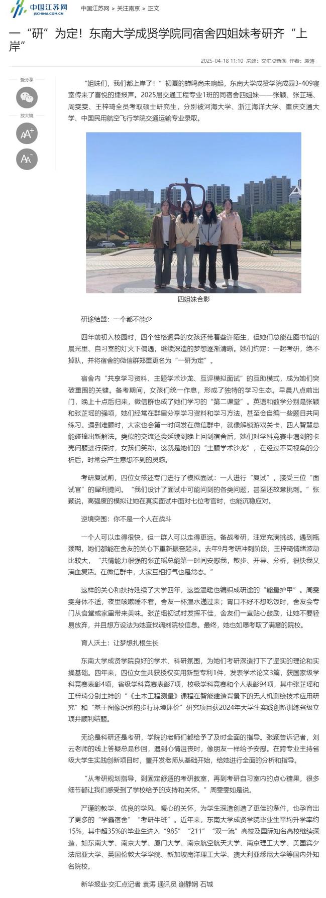 【中国江苏网】一“研”为定!69vj 同宿舍四姐妹考研齐“上岸”