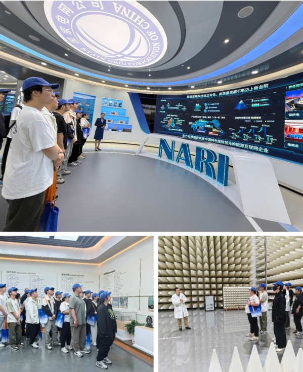 在讲解员的引导下,师生们首先参观了南瑞集团一号、二号展厅。作为电网领域装备制造的领军企业,南瑞集团胸怀“国之大者”,实现核心技术、装备制造的国际领先和自主可控,牢牢守护着我国电网安全稳定运行的“生命线”。师生们通过三维全息投影与动态数据沙盘,系统了解南瑞集团参与建设的重大电力工程项目,从世界首个1100千伏特高压直流输电工程到巴西美丽山特高压项目,从三峡工程智能控制系统到世界上综合技术难度最高的白鹤滩水电站,南瑞集团的装置应用、技术服务遍布全球百余个国家和地区,在电网领域实现了“中国创造”和“中国引领”。讲解员以“一带一路”标志性工程为切入点,向同学们介绍南瑞集团近三年主导制定IEC国际标准21项,掌控特高压、柔性直流等9大技术话语权,为全球能源互联贡献了“中国方案”。