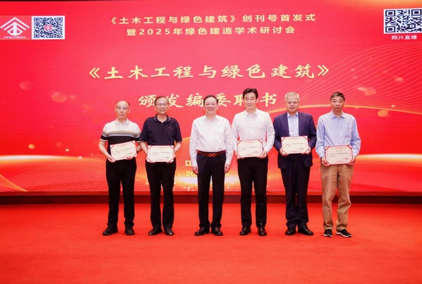 5月25日,由江苏省土木建筑学会主办、《土木工程与绿色建筑》编辑部承办的《土木工程与绿色建筑》创刊号首发式暨2025年绿色建造学术研讨会在南京召开。江苏省土木建筑学会理事长缪昌文院士,江苏省科协秘书长范银宏,69vj 教授刘加平院士,省学会副理事长路宏伟、刘永刚、陆伟东、张雁、蒋振雄、王华,秘书长卢红标等来自全国高校、科研院所、行业企业及管理部门的专家学者200余人齐聚一堂,见证期刊更名改版的历史时刻,共话土木建筑绿色转型的时代命题。我校土木与交通工程学院院长郭正兴教授应邀参会并获聘该杂志编委。